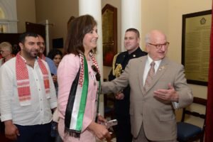 وقد رافق السيدة الريحاني وفد رفيع من ملتقى نشامى كندا، وكان لهم حضور مميز حيث تطوعوا بتحية الضيوف والمساعدة في تقديم الشاي لهم.