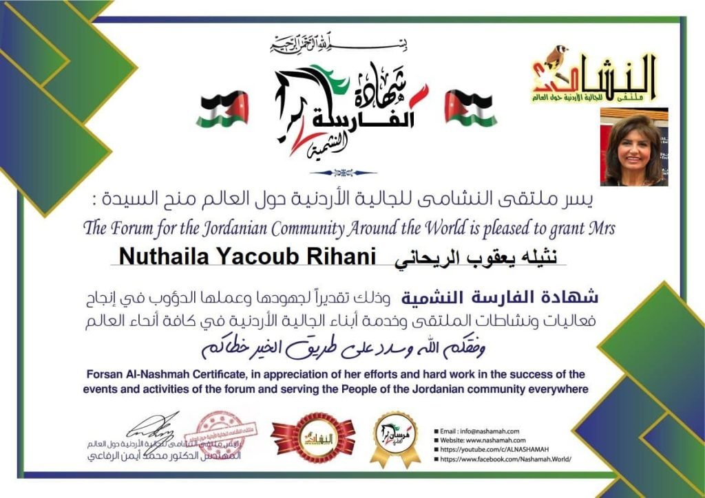 كرّم ملتقى النشامى للجالية الأردنية حول العالم السيدة، نثيلة يعقوب الريحاني، بمنحها “شهادة الفارسة النشمية”، وذلك تقديراً لإسهاماتها الكبيرة وجهودها المخلصة في إنجاح أنشطة وفعاليات الملتقى، إلى جانب خدمتها لأبناء الجالية الأردنية في مختلف دول العالم.