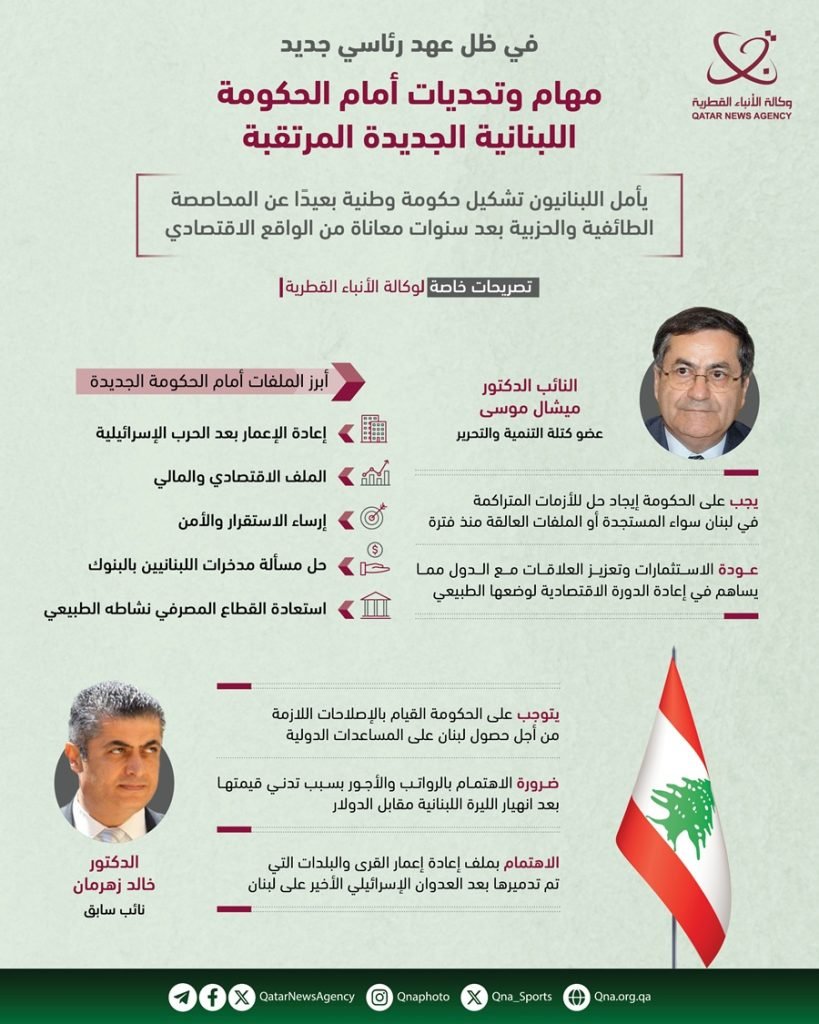 ومن جهته أكد الدكتور خالد زهرمان النائب السابق، في تصريح لوكالة الأنباء القطرية “قنا” أنه يتوجب على الحكومة الجديدة القيام بالإصلاحات اللازمة من أجل حصول لبنان على المساعدات الدولية.. موضحا أن لبنان لن يستطيع الحصول على هذه المساعدات التي تساعده على الخروج من أزماته الاقتصادية والمالية المتراكمة دون دعم المجتمع الدولي.
