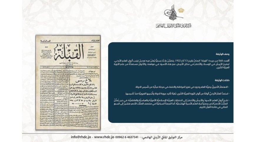 بمناسبة ذِكرى يوم العلم الأردني، الذي يُصادِفُ السادسَ عشرَ من نيسان، نشرَ مركزُ التوثيق الملكيُّ الأردنيُّ الهاشميُّ وثيقةً من أرشيفه تُظهِرُ العدد 568 من جريدة “القِبلة” الصادرة بتاريخ 13 آذار 1922.