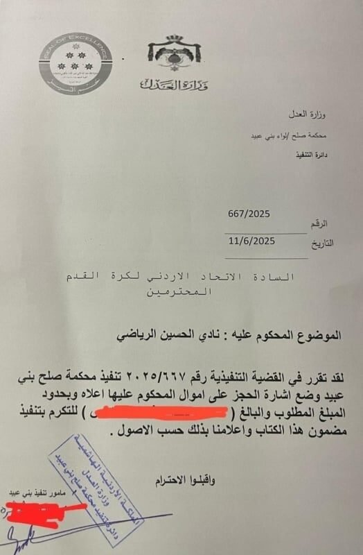 تلقى نادي الحسين إربد الأربعاء، قرارا من دائرة التنفيذ لمحكمة صلح لواء بني عبيد التابعة لوزارة العدل، بالحجز على أموال النادي لدى البنوك المعتمدة.