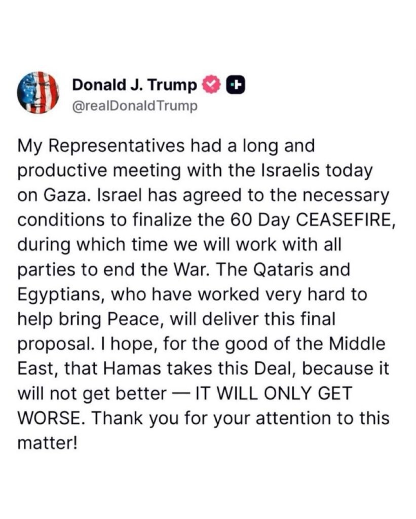 وقال ترامب في منشور على مواقع التواصل الاجتماعي “وافقت إسرائيل على الشروط اللازمة لإتمام وقف إطلاق النار لمدة 60 يوما، وسنعمل خلال هذه الفترة مع جميع الأطراف لإنهاء الحرب”.