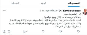 كتب عضو المجلس الوطني الفلسطيني، رئيس جمعية جذور لحقوق المواطن، د. فوزي السمهوري على صفحته الخاصة بموقع إكس، إلى الرئيس ترامب