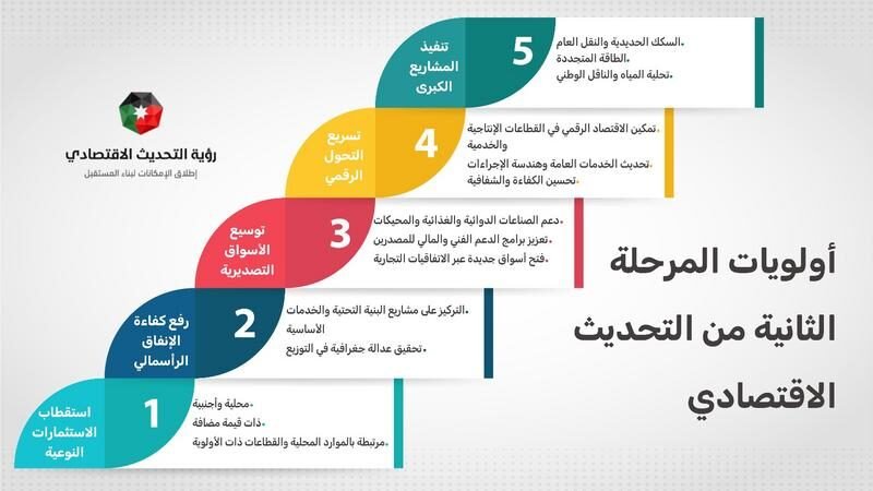 وبينما تتسارع الخطوات الرسمية لوضع البرنامج التنفيذي المقبل، أكد معنيون بالشأن الاقتصادي لوكالة الأنباء الأردنية (بترا)، أن المرحلة الثانية من رؤية التحديث الاقتصادي تتطلب أولويات واضحة تركز على استقطاب الاستثمارات النوعية، ورفع كفاءة الإنفاق الرأسمالي، وتوسيع الأسواق التصديرية، وتنفيذ المشروعات الكبرى.