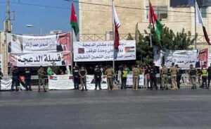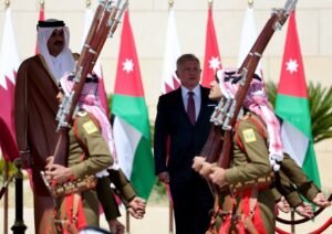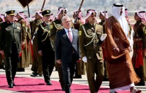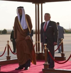 ورافقت طائرات مقاتلة من سلاح الجو الملكي الأردني طائرة سمو الشيخ تميم لدى دخولها أجواء المملكة، ترحيبا بسموه.