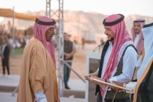 وسلم سموه، بحضور رئيس الاتحاد العربي للهجن سمو الأمير فهد بن جلوي، جوائز للحاصلين على المراكز الأولى في بطولة كأس العرب للهجن، ومهرجان الأردن لسباقات الهجن والشعر النبطي.