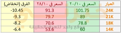 مرفق جدول توضيحي ، واسعار الذهب في اليومين المذكورين