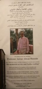 اقامت عائلة العالم العراقي المغترب الراحل البروفيسور أنور علوان حسين الريس والذي يعد احد اشهر علماء الادوية وأساتذة الصيدلة في العراق والعالم والذي ارتبط اسمه بأنجح البرامج البحثية الصيدلانيّة.حيث وافته المنية قبل أيام في الولايات المتحدة الأميركية مجلس فاتحة وحفل تأبين كبير حضره عدد كبير من النخب العلمية والشخصيات الاكاديمية العربية والعراقية المقيمين في العاصمة عمان، تكريماً لروح الفقيد المغفور له بإذن الله وتقديراً لمسيرته العلمية والمعرفية والإنسانية وخدماته الجليلة حفل تابين في قاعة جمعية الريحاني بعمان مساء الاثنين.