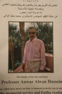 رحم الله العالم العراقي العربي الراحل البروفيسور أنور علوان حسين الريس واسكنه فسيح جناته والهم اهله الصبر والسلوان وانا لله وانا اليه راجعون.