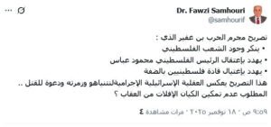 كتب عضو المجلس الوطني الفلسطيني، رئيس جمعية جذور لحقوق المواطن، د. فوزي السمهوري على صفحته الخاصة بموقع إكس