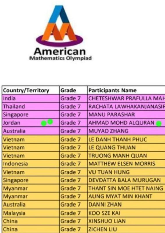 فاز الطالب الأردني أحمد محمد القرعان من الصف الثامن في مدرسة الملك عبدالله الثاني للتميز – الزرقاء بالمركز الأول مكرر عالميًا في مسابقة أولمبياد الرياضيات الأمريكي (AMO)، محققًا إنجازًا دوليًا يضاف إلى سجل نجاحات الطلبة الأردنيين.