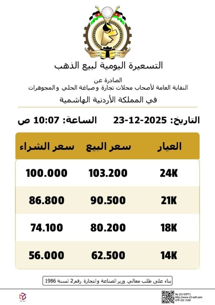 وبلغ سعر بيع غرام الذهب عيار 21 عند 90.5 دينارا لغايات البيع من محلات الصاغة، مقابل 86.80 دينارا لجهة الشراء، لأول مره في الأردن.