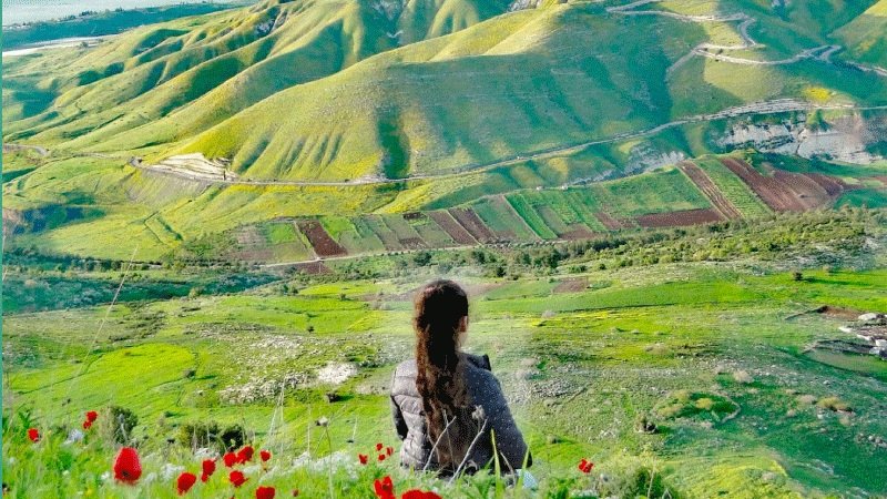 من مرتفعات أم قيس، تجلس بهدوء الضوء طفلة صغيرة لتنير لوحة واسعة من الأخضر.