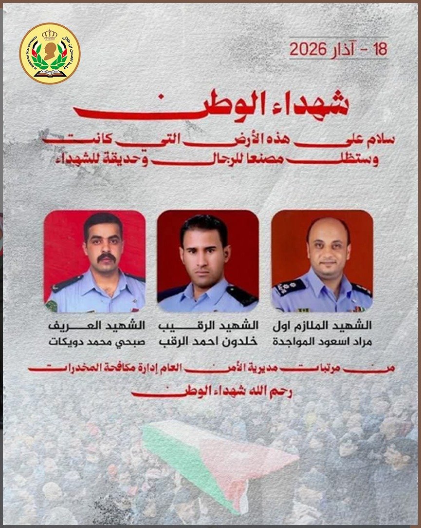 وأكد الخرابشة أن شهداء الواجب جسدوا بدمائهم الزكية أسمى معاني التضحية والفداء، وقدموا أرواحهم الطاهرة دفاعًا عن الأردن في مواجهة آفة المخدرات التي تستهدف أمن المجتمع واستقراره، مشددًا على أن هذه التضحيات ستبقى مصدر فخر واعتزاز لكل الأردنيين، ودليلًا راسخًا على بسالة نشامى الأجهزة الأمنية وإخلاصهم.