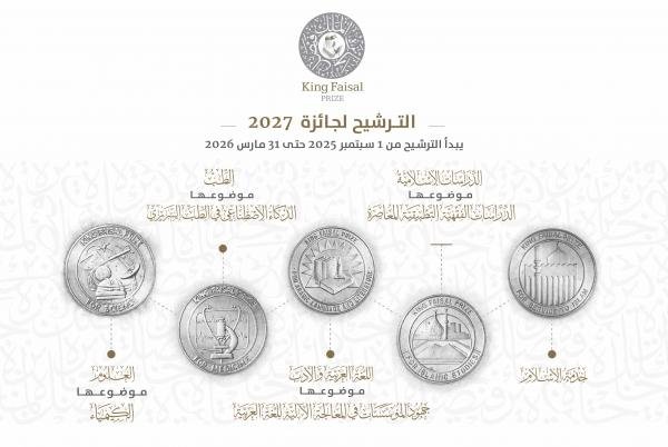تنتهي في الحادي والثلاثين من شهر مارس الجاري الفترة المحددة لاستقبال طلبات الترشيح لجائزة الملك فيصل في دورتها التاسعة والأربعين 2027، في أفرع الجائزة الخمسة تمهيداً لبدء أعمال لجان الفرز والتحكيم الدولية.