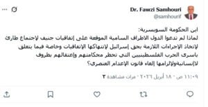 كتب عضو المجلس الوطني الفلسطيني، رئيس جمعية جذور لحقوق المواطن، د. فوزي السمهوري على صفحته الخاصة بموقع إكس، اين الحكومة السويسرية: