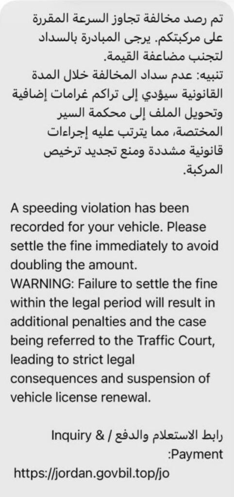 حذّرت وحدة الجرائم الإلكترونية المواطنين من التعامل مع رسائل وهمية ترد لهواتفهم وتوهم مستقبليها بأنها صادرة عن جهات رسمية، وتطلب منهم المسارعة إلى دفع قيمة مخالفاتهم المرورية من خلال الدخول إلى رابط احتيالية مرفقة داخل الرسالة لتجنّب مضاعفة قيمة المخالفة المالية او اضافة غرامات عليها .