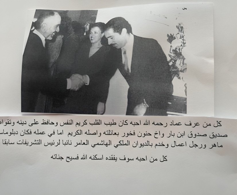 كل من عرف عماد رحمه اللّٰه احبه كان طيب القلب كريم النفس وحافظ على دينه وتقواه صديق صدوق ابن بار واخ حنون فخور بعائلته واصله الكريم اما في عمله فكان دبلوماسي ماهر ورجل اعمال وخدم بالديوان الملكي الهاشمي العامر نائبا لرئيس التشريفات سابقا كل من احبه سوف يفقده اسكنه اللّٰه فسيح جناته